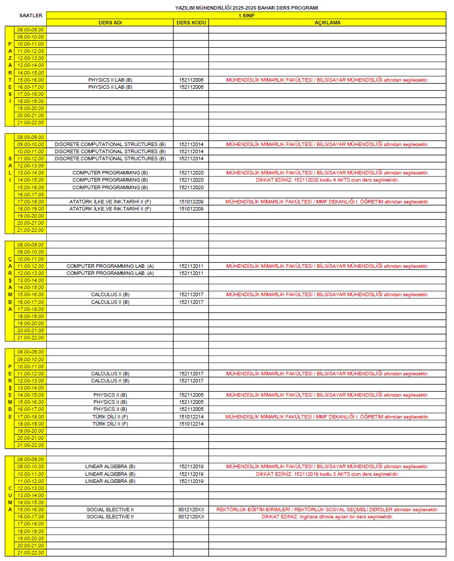 2025–2026 Bahar Yarıyılı Yazılım Mühendisliği Bölümü 1. sınıf ders programı aşağıda paylaşılmıştır. Ders kayıt sürecinde herhangi bir sorun yaşamamanız için aşağıdaki hususlara dikkatle uymanız önemle rica olunur: