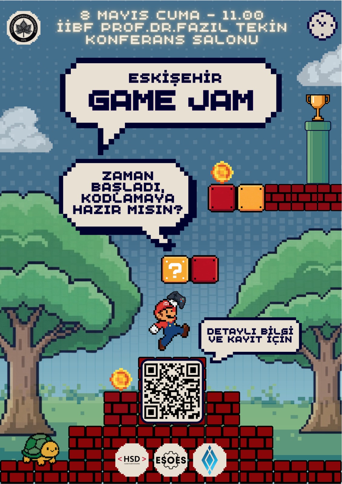 ESOES (Engineering Society of Eskişehir) topluluğu tarafından düzenlenen Game Jam etkinliği, katılımcı takımların sınırlı bir süre içerisinde yaratıcı fikirler geliştirerek oyun projeleri ortaya koymalarını amaçlayan dinamik ve üretken bir organizasyondur. Etkinlik, 8 Mayıs 2026 tarihinde saat 11.00'de ESOGÜ Prof. Dr. Fazıl Tekin Konferans Salonu'nda gerçekleştirilecektir.